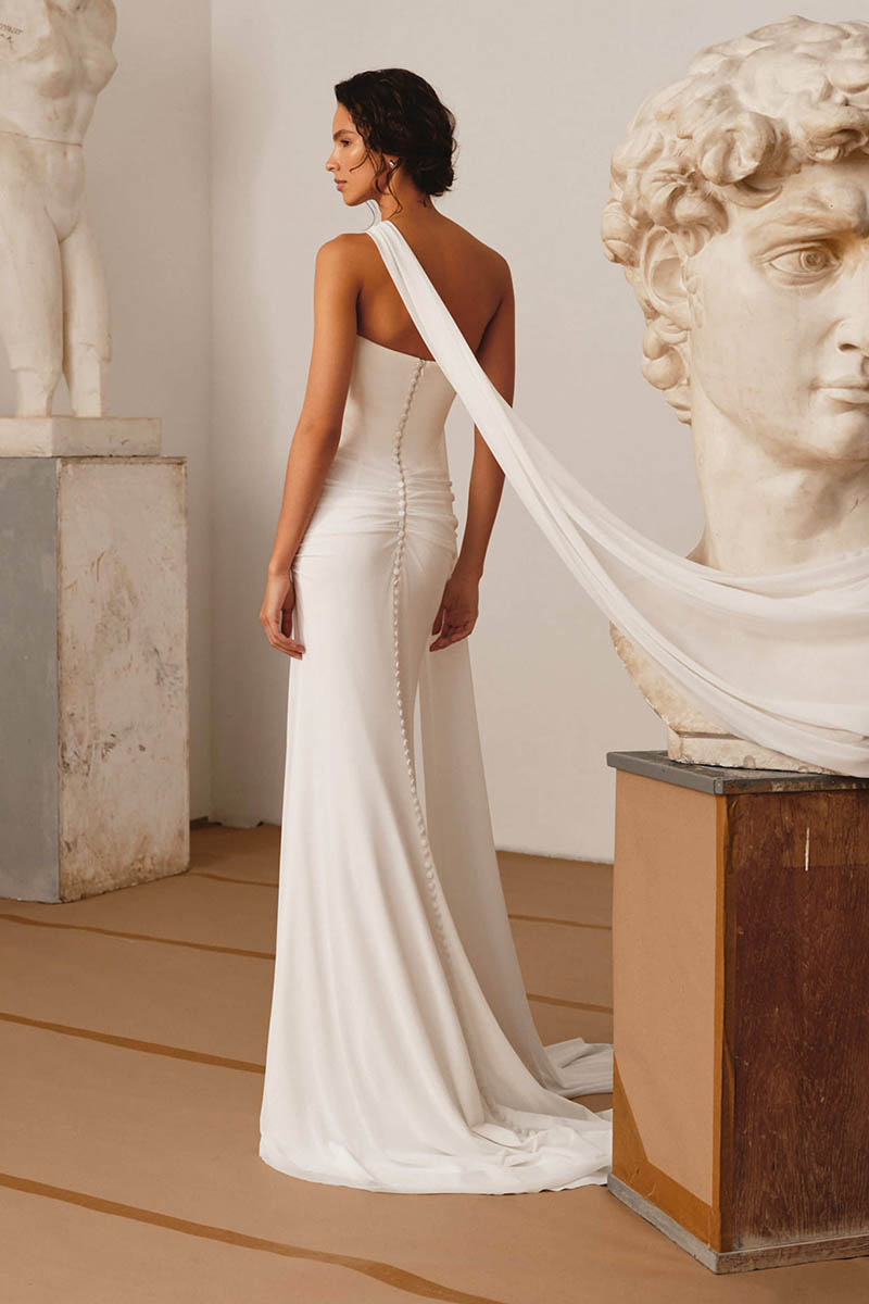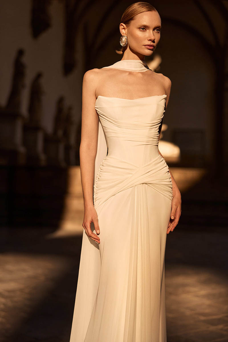 Caladriel by Milla Nova is a sleek, sculpted gown that balances minimalist elegance with soft, fluid detailing. The strapless bodice features delicate draping across the neckline, flowing into a fitted silhouette that gently skims the body for a refined, elongated shape. A row of covered buttons traces the back, adding a timeless bridal finish, while the optional sheer scarf introduces movement and a contemporary, fashion-forward edge. Effortlessly elegant on its own or styled with lace gloves or sleeves, it offers a modern, versatile take on classic bridal dressing.